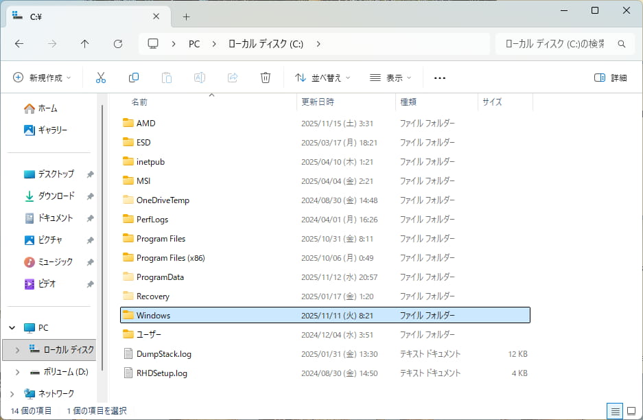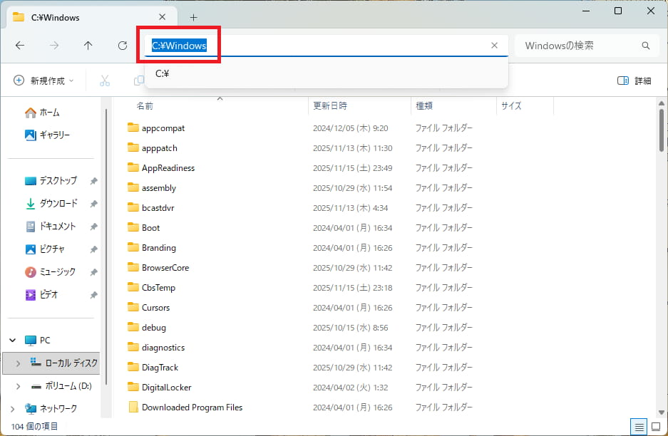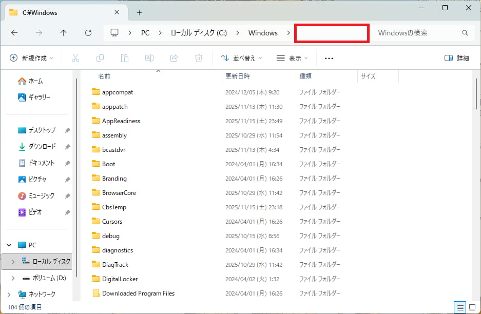 ここでは例としてC:\Windowsフォルダーをエクスプローラーで開いている状態で進めてみます。