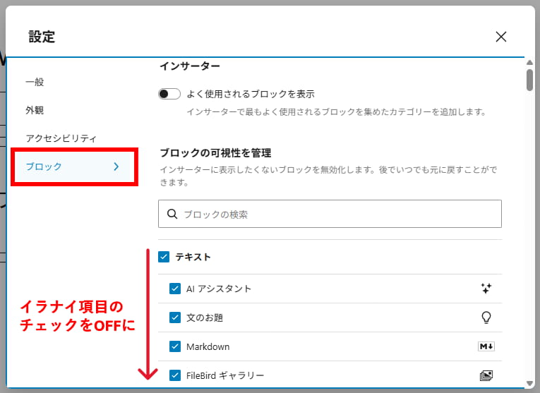 ブロックの項目に移動すると一覧が表示されるので、イラナイものはチェックを外すと表示されなくなります。