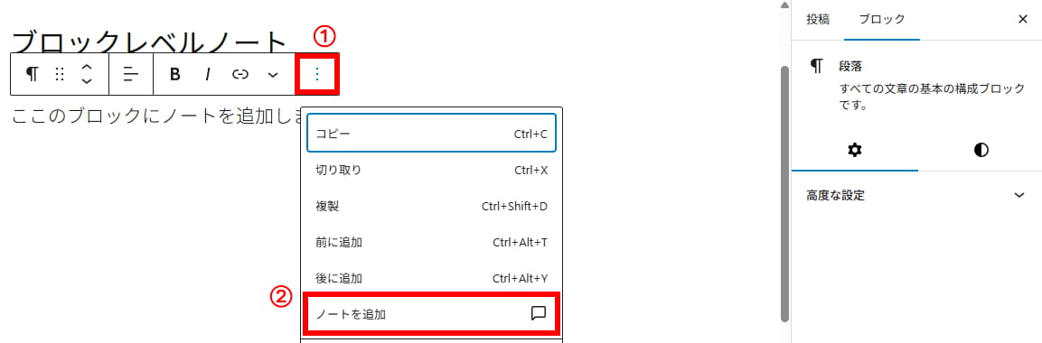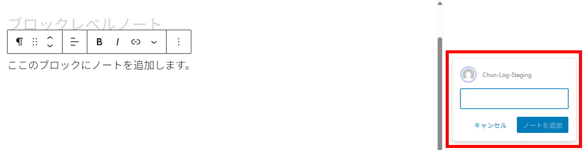 ブロックごとにノートを追加することができます。ノートとは管理者画面のエディターだけで見れるメモやコメントのようなものです。