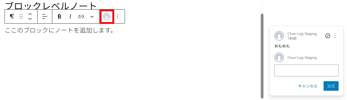ートが追加されました。また、ノートが存在するブロックを選択したするとオプションメニューの左側にメモを記載したユーザーのアイコンが表示されます。また、追加されたノートはスクロールに追従して表示されるのでどのブロックにノートがあるかわかりやすくなっています。