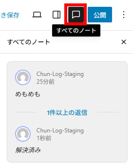 編集中の記事内にノートが存在する場合、画面右上にすべてのノートのボタンが表示されています。ここをクリックすることですべてのノートを一覧で見ることができます。この表示はスクロールに追従はせず一覧表示するのみです。解決済みのノートも見ることができます。