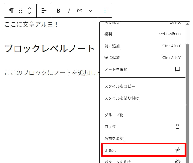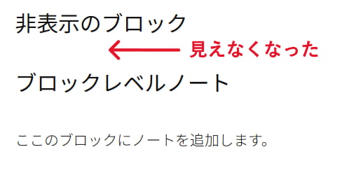 ブロックのオプションから非表示を選択するとブロックが見えなくなります。