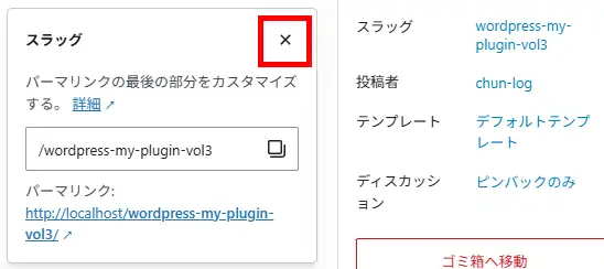 スラッグ変更のポップアップの閉じるボタン